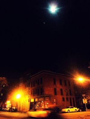 It was such a beautiful evening tonight as I pedaled home…unseasonably warm for this time of year, not a breeze or cloud to be found, and the nearly full moon shone high in the sky (if you look close you can see a star or planet clearly visible to the moon’s lower left). It was such an awesome night I snapped a few photos and thought I’d share. This photo was taken here. (click for a larger view).