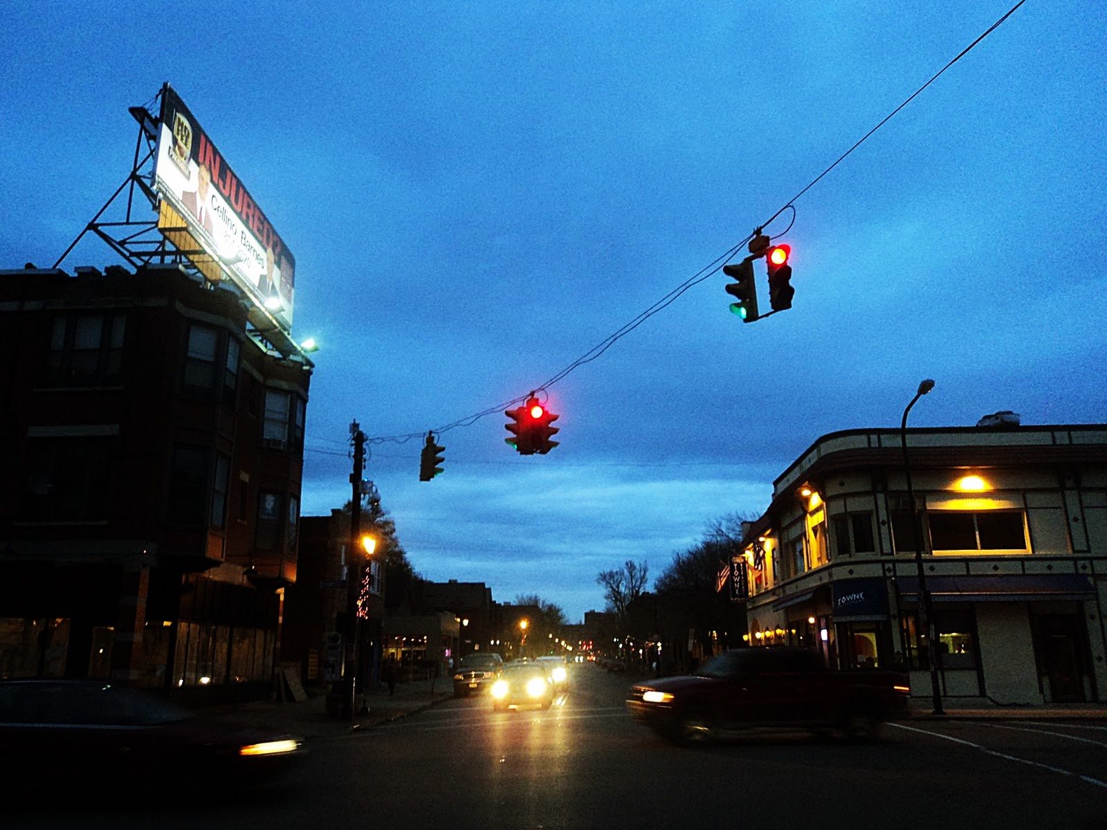 The above image is one I took while waiting for the traffic light to change earlier this evening; I was at the corner of Allen Street and Elmwood Avenue (here), which is not only one of my favorite intersections in our city but also the heart of the Allentown neighborhood and the one in which I reside. It was a little after 5pm and just getting dark. I had a crazy day at work (a really crazy day) and felt like going to the health club for a steam and swim (nothing like an endorphin rush to change your mood) and as I was waiting for the light to chang I was in awe at what a beautiful evening it was. It also felt so good to be out of the stuffy kitchen and on a bike in the fresh air. The high temp today was freakishly warm for this time of year…something like 72F/22C. And as I sat there watching cars pass before me I couldn’t help but think that how glad I was to be on my bike and not confined in my truck; I was glad to be an active rider rather than a passive driver; I was glad to hear the sounds of the city rather than the 5 o’clock news on my radio (should I go on?). Anyhow, you get the picture. So I suppose if I had to say another reason that I like to ride a bike it would be that it is relaxing and enjoyable, not just a mode of transport (or a way to carry things). About an hour later I exited the health club just after it had just stopped raining…it had that damp feel and smell in the air that only happens after a rain. On my way home I stopped for a couple things for dinner at two different stores and pedaled and coasted refreshed from my steam and swim. There are so many reasons to ride a bike–some obvious and some not so much–and some of the reasons are likly personal to the rider, but for me one of the main reasons is that I enjoy it. I’ve posted the video titled A Reason to Ride on more than one occasion and thought about posting it again but opted not to (but you can see it here). Instead, on my way home I held out my camera and captured a few seconds of my evening commute. Nothing happens really; no excitement. It’s just a middle-aged guy pedaling and coasting home with a few things for dinner strapped to his bike. But that’s just it, I supposed…it’s not really about anything other than daily life.