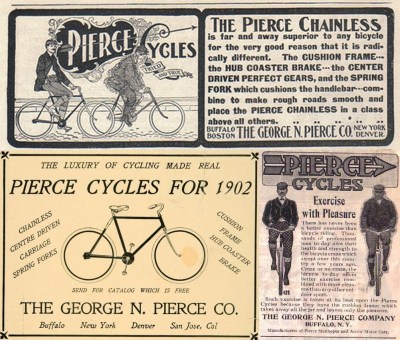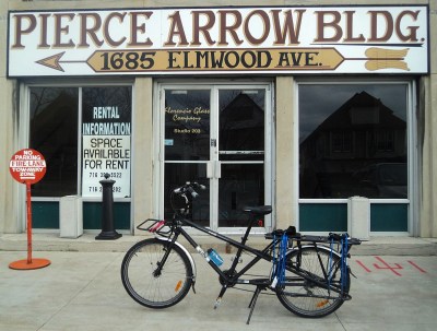 I think this picture is really interesting but can’t wonder if it’s not a bit ironic. I often ride past this building on my way to a store; it’s the original Pierce Arrow building, which was once the factory of luxury cars by the same name. But what a lot of people don’t realize is that this company, along with a lot of other automobile companies, began as a bicycle companie….and many of the original car mechanics were bicycle mechanics. Interestingly, at both of the websites for the Pierce Arrow Transportation Museum (click here or here) there are no mention of bicycles. According to Carl Burgwardt, in his book Buffalo’s Bicycles, in 1900 the Buffalo City Directory listed seventy-nine bicycle manufacturers and 136 dealers, and that it was because of the bicycle that road signs and rules came into existence. As aforementioned, on the websites of the transportation museum there are no images or links to bicycles. I’ve not yet been there yet (I really should go), but I can only hope that there are some bikes on display as well as the cars. Anyhow, with the current gas/car/environmental “crisis” I can only wonder what the future of transportation has in store…but I still can’t help wonder if the above photo is not just a bit ironic.