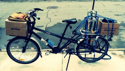 Rear Carrier: A 15lb/6.8kg capacity all-steel, hand-crank sausage stuffer; a cardboard box containing two pints of homemade turkey gravy, 5lbs/2.2kgs of bread flour, and three homemade cheese balls.