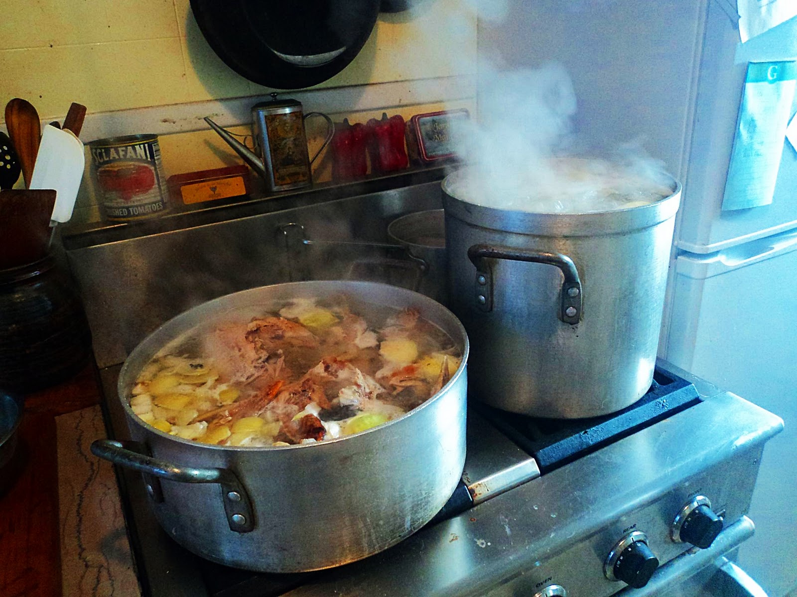 Well, if you are an American reading this blog, or an expat living abroad, you likely celebrated Thanksgiving dinner yesterday with a traditional turkey dinner. I personally love this holiday–it’s not so gift-centered and commercialized as Christmas has become–it’s more about getting together with family, being thankful, and eating a really good meal. Unfortunately the day after has become known as “Black Friday,” but with me–while all the lunatics are out at pre-dawn trying to save a few dollars–I usually lounge around the house while turkey broth simmers on the stove from yesterdays carcass…the left-overs, to me, are as good as the meal proper, and making broth from the carcasses is yet another perk. I’ll make a large batch of it, strain it, then cool it (that’s it below occupying the an entire bottom half of my apartment-sized fridge), and then package it in increments of quarts and pints. Afterwards, I’ll freeze it and have super-delicious broth for the next couple months (it’s great not only for soup, but is especially suited for rice dishes). And while broth is about as simple as it gets when it comes to cooking, there are a few rules to follow. There’s a simple recipe below, but if you’d like a more in-depth look at it, with additional recipes, click this link: Broth, Bouillon, Brodo.