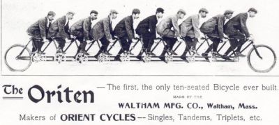 I came across the above photo at the Facebook page of Car-Free America. It is–as it’s description says–the Oriten, a ten-seat bike made by the Orient Bicycle company. I had never heard of such a thing, but after Googling it I was surprised to see that it was quite popular around the time it was manufactured (1896); there were even races designed specifically for bikes with ten seats. When I look at the photo(s) a few things come to mind. One is I’m wondering if there was any frame flex with ten grown men sitting on it. Another is, I wonder how fast they could go with ten men pedaling (and that’s a lot of responsibility for the guy steering). And lastly, and this is just a personal one I suppose (but aren’t all opinions)…it just looks a little…well…a bit too close for comfort being sandwiched in there like that. At any rate, it would likely be a fun night out with the guys…having a few pints and not worrying about who’s driving home (I also wonder if you could ride it with just two or three guys…the thing must have weighed a ton). Anyhow, here’s a few more photos I came across.
