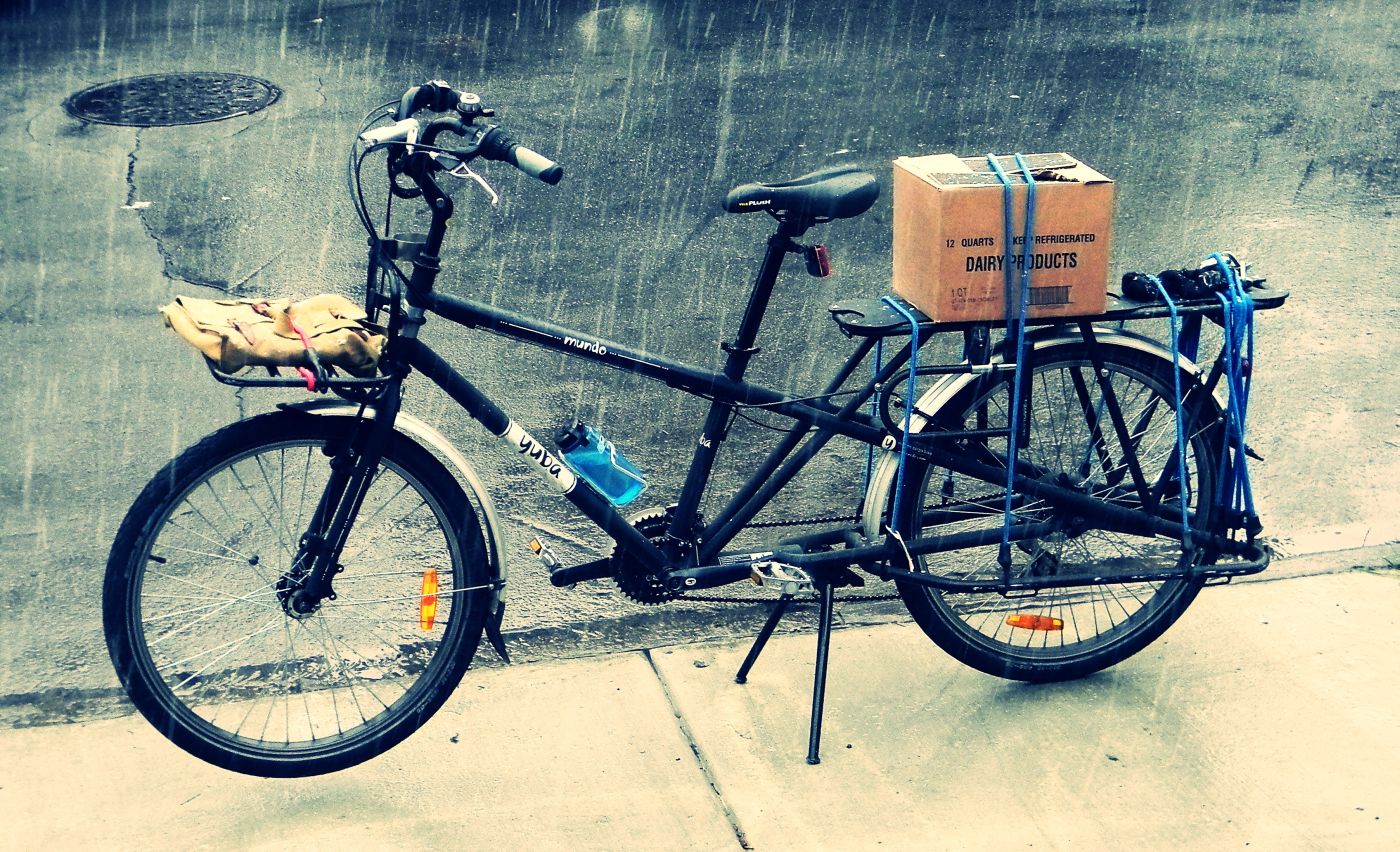 Things on the bike: A canvas book bag containing two books; a cardboard box containing a just-kneaded batch of whole-wheat honey-oatmeal bread (see below for recipe), a small container of oatmeal, 2 pints of 3-bean soup with pork, 2 re-gifted coffee cups, and an extra pair of gloves (yes that’s snow coming down and visible in the above picture; first of the year…late for this region).