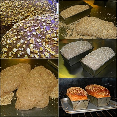 Transferthe dough to a work surface, cut it into two pieces, gently shape itinto loaves. Dust the counter with extra oatmeal and roll the loavesin it, gently pressing oatmeal into the surface of the raw dough.Place the loaves into oiled loaf pans, cover with plastic wrap, andallow to rise for 45 minutes. Preheat an oven to 400F.