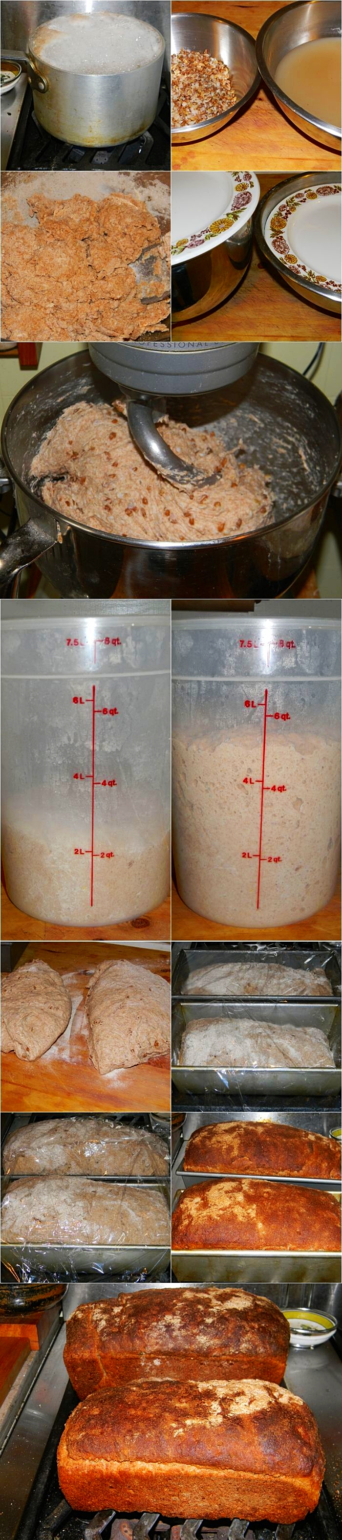 Place two bowlsside-by-side; one will hold the pre-ferment, the other autolyse. Inone bowl combine the cooked and drained 7-grains with 2/3 cup (5.3oz/157ml) of the cooking liquid, 2 cups (11oz/312g) whole wheatflour, and 2 teaspoons (.2oz/5.6g) instant yeast. Stir just untilcombined then cover it with plastic wrap. In the other bowl combine 4cups (21oz/595.3g) whole wheat flour, 2 tablespoons (.5oz/14g) vitalwheat gluten, and 1 1/3 cups (10.5fl oz/315ml) cooking liquid; stirjust until combined then cover it with plastic wrap (take care not toget yeast into this bowl). Allow the bowls to rest at roomtemperature for about an hour, during which time the preferment willbegin it’s job multiplying yeast and fermenting flour, and theautolyse will soak liquid, swelling the gluten.