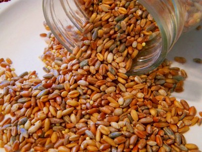 As many of you know, I like bread. A lot. I enjoy making it, but more importantly I enjoy eating it…and I do not believe it makes you fat. I could easily be a poster boy for the high-carb diet…I eat bread, pasta, or rice at nearly every meal and am well within my proper body weight. The key, I believe, is whole grains…they are really good for you. I also believe that everyone should make their own bread (at least sometimes)…not only will it nourish your body, but also your emotions; there is something very primal about having your hands in raw dough and transforming ingredients so basic into something so complex. It is, in short, an alchemistic art-form. And breads you purchase–even though they may say “whole grain”–have a lot of other things in it besides the grain. Take a look at this label for “whole grain bread”…a paragraph long list of mostly unpronounceable ingredients is unnecessary.  In truth, to make a really good and wholesome loaf of whole wheat bread you need only these four ingredients. In the recipe pictured here–bedsides the seven-grain mix–I count eight other ingredients…all recognizable and pronounceable. If you don’t have a seven grain mix you can use whatever grain you have (brown rice works great). This is made in the same way that I make Ezekiel Bread, only it’s easier because you can boil the grain all at once (click here or here for Ezekiel Bread recipes). Anyhow, this recipe is way easier to make than it may seem at first look. I hope you try it…both your body and soul will be glad you did. If you’d like to read more about how to bake with whole wheat–it’s similarities and differences with white flour–follow this link.