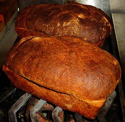 Bake thebreads for about 30-40 minutes, adding steam to the oven a few times(either with ice cubes or a spray bottle) and rotating the breadsevery ten minutes. The breads are done when they are dark brown andsound hollow when tapped upon. Remove the breads from their pans andallow them to cook on a wire rack for at least 10 minutes beforeslicing.