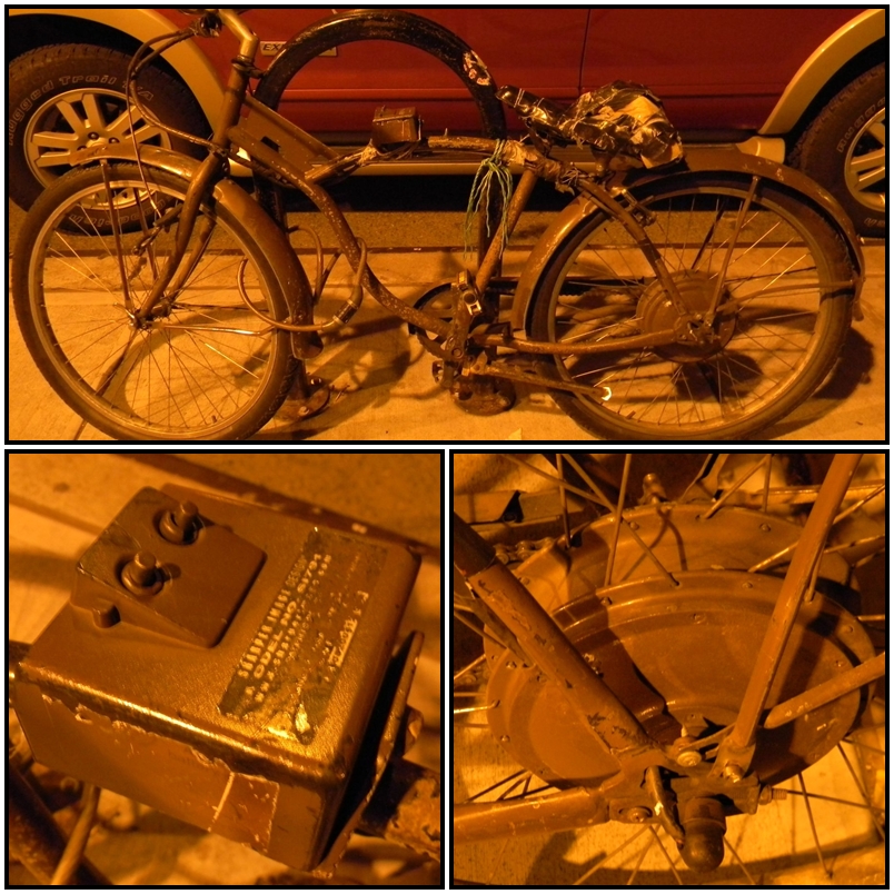 I love old bikes…especially those that are still in use. This is an example; I came across it locked to a stand in Greenwich Village last night. In a city like New York you see plenty of old bike leaning around (probably less likely to get stolen than a shiny new one), but what caught my eye about this one as I was walking by was the box on its crossbar (looks like a control box of sorts). And at closer inspection I saw the enlarged rear axle. Could this be an early electric bike…possibly a WWII bike? It looks like it weighs a tone. Anyhow, I just thought I’d pass this out to the blogesphere. If anyone has any thoughts on this I’d love to hear them. You’ve got to admit it is a pretty cool looking bike.