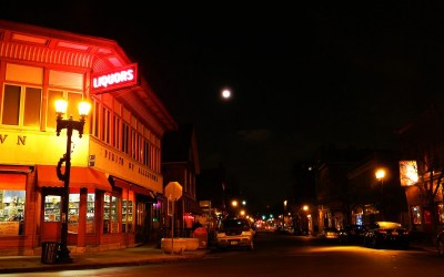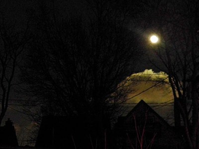 Technically, the moon was full two nights ago but I took these last night when it was waning (it still looked pretty full to me). I have always been drawn to a full moon…not sure why, it just fascinates me looming so large in the sky. Anyhow, last night I was out on the Mundo and snapped a few photos. The one above is taken at the far end of Allen Street here in Buffalo, the main thoroughfare through my favorite neighborhood and also the one in which I live. The below photo was taken just a block north on Wadsworth Street, overlooking houses there. And it’s interesting, I think, what some people must think of me when they see me hunched next to my bike with a camera and mini-tripod perched on it. At one point, when I was taking the below picture a woman was coming down the street and saw me next to the bike and began to cross the street…she looked a little scared. I actually told her, as she approached, not to worry I’m just taking a few photos (then I wondered if that made her fear me even more). Anyhow, I enjoy taking pictures in different levels of light…dawn, dusk, and night are my favorites. And as I was taking these I was thinking about winter–or more specifically, the lack of it this year–how we can’t count on snow in the winter these days, but we can still count on the sun and moon rising and falling each day and night. Click either for a larger view.