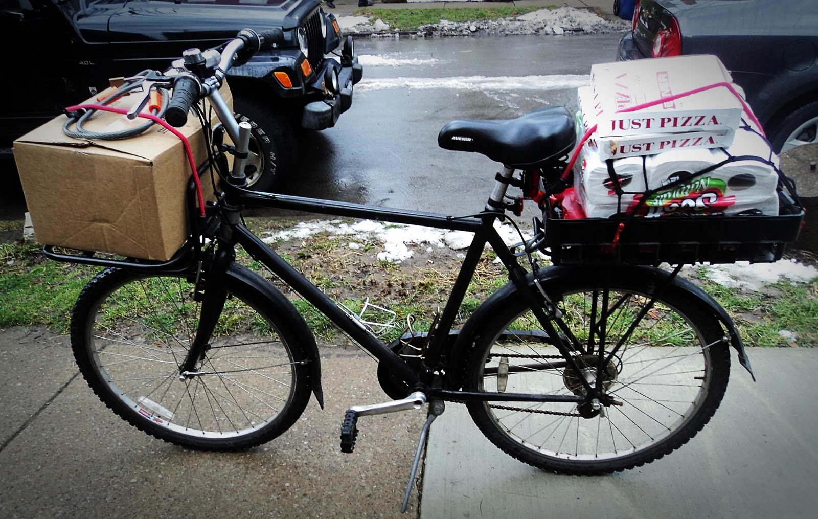 $132.72 in groceries, sundries, and dog food (and four slices of pizza), in a cardboard box and soda crate from three separate stores.