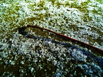 Winter, I think, is an amazing time to take photos…an amazing time in general, especially with the crazy weather we’ve had this year. The contrast of color-to-bleak and lush-to-stark inspires me. The above photo (birds in a tree) was taken yesterday when we had crazy-strong wind gusts…the birds just swayed back and forth in the wind at the top of the tree. The photo directly below (stick, moss, and snow) is of a ledge on a stone wall that I see nearly every day as I leave work…the time of day is just right; the light–when the clouds break–enhances any small debris that the wind happens to blow onto the ledge. And the bottom photo (frozen herb) is a picture of my front yard…despite the roller coaster weather the parsley still survives and thrives. After snapping the picture I ate a couple leaves. Click any image for a larger view.