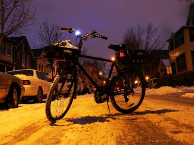Nearly $75US of groceries on an ordinary mountain bike in two plastic soda crates from three separate stores on a frigid and snowy evening.