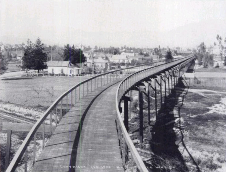 I have long been interested in the history of the bicycle. I’ve also been to California numerous times, though never to Los Angeles. And quite frankly, I would never think of bicycle history and Los Angeles in the same thought. More likely, and this is stereotyping (please, Los Angelers, don’t send me hate mail), I think of cars and wide highways. But 100 years ago this wasn’t the case…they were on the cutting edge. You can imagine my surprise and intrigue when I came upon an article about the California Cycleway. Built in 1900 and dismantled about 10 years later, it’s original intention was to link Pasadena with L.A….via an elevated bike path. To read more about it on Wikipedia, click here. For a well-written story about it–with more photos, I recommend this site. Am I the only cyclist who thinks that path looks like a ton of fun?