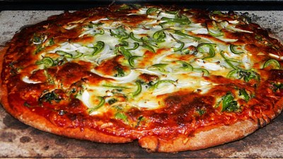 This is really a variation on two themes I’ve touched on before…vegetables cooked aglio e olio and a pizza recipe. In this version I used rapini, which I cooked with oil, garlic, and hot pepper, and the pizza crust was made using a hand-kneaded oatmeal crust (click here for the recipe). The main difference with rapini, I think, is that it is often blanched or briefly par-boiled before sauteing. This is an option, and some cooks may disagree, but I feel it removes some of its bitterness. Nonetheless, this is a delicious preparation for any vegetable, so I should warn you to cook extra…if you’re like me you’ll eat a good portion of it before it makes it to the pizza. Anyhow, here it is in pictures; if you’d like a recipe of vegetables and pasta being cooked in this fashion–and a better explanation with photos–click here.