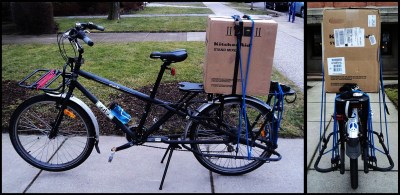 Second comment: When I ordered the mixer I had it delivered to my place of employment because I am there during business/delivery hours…I didn’t want to miss it. It arrived today, and before I left I rode my bike around the city block to the front of the building where it was delivered (the hired help–even the chef–enters the rear of the building, which is fine with me). Anyhow, upon seeing me with my bike the general manager and the office manager both offered to drive me home with the package. No thanks, I told them, this bike is built to carry stuff…and you know me by now, this is how I like to do it. Almost without listening, the manager said that she would call the maintenance man and have him drive me home…that he has a pickup truck. Really, I told them, and thank you very much, but this bike can handle it, and I reminded them that I too owned a pickup truck, but I choose to ride and carry things on my bike(s) when I can. Finally they let me go, but they still looked a little worried. As I was strapping the box down a guy walked past me on the sidewalk (pavements), smiled and said, Geez, that’s quite a bike you have there. Yes it is, I replied, and pedaled and coasted home nearly effortlessly on this beautiful and unseasonably warm spring-like evening.