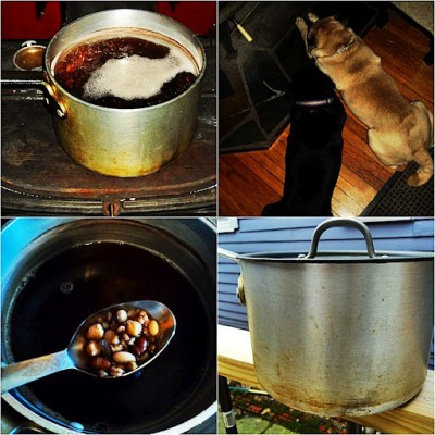 This morning, shortly after lighting a fire in the wood-burning stove, I boiled some beans and grains. I don’t often use the wood-burning stove to cook on that often–in fact I haven’t used it as often as usual for heat because of the mild winter–but today I did, and the boiling grain made the house smell great (my two pugs loved it…that’s them below sleeping next to the stove). And over the years my view of this recipe–or more specifically, my  view of the beans and grains involved–are on the same line with my view of theology…extremely liberal (to read more about my liberal views of this bread, click here). Today, for example, I didn’t have millet or bulgur but did have brown rice and chick peas so I used them instead…nearly any bean or grain will do (but not to worry, the recipe listed below is tried and tested…and it works). Anyhow, while I had my coffee, checked emails, Facebook, and updated this blog…the beans and grains boiled. When they were done I placed them outside on a rear porch railing to cool (it was only 32F/0C…why tax my fridge). And while it cooled I went and did a few errands on my bike, stopped at a coffee shop, and took a few photos.