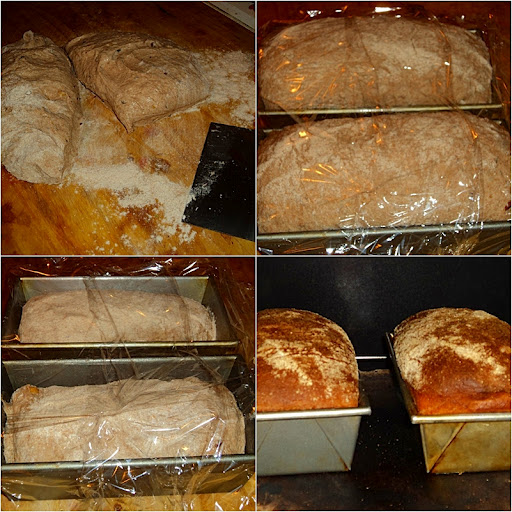Turn the dough out onto a floured work surface andcut it into 2 or 3 pieces. Shape into loaves and place into lightlyoiled pans. Loosely cover the loaves with plastic wrap and allow toferment for 30-60 minutes, or until double in size and when gentlytouched with a fingertip an indentation remains.