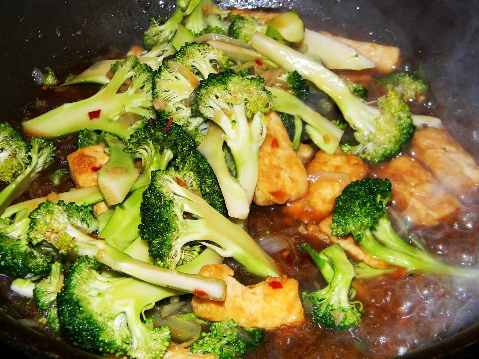 Stir inthe chicken broth; bring it to a boil, than stir in thesoy-cornstarch mixture. Bring it to a simmer, then add the broccoliand bean curd. Stir and toss it to evenly coat it with sauce.Continue to heat the pan just until the broccoli is heatedthroughout.