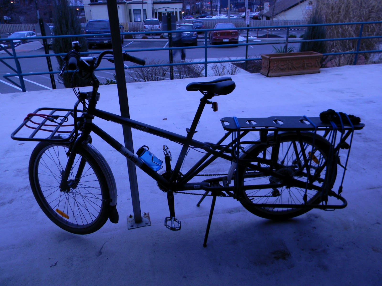 I have two heavy locks on the bike–a U-lock and a chain/padlock–but…neither of them are locked. I must have been thinking of something else as I pulled up and unloaded the bike. I parked it in it’s usual spot but didn’t lock it. And I was in the club longer than usual tonight…nearly two hours it sat there unattended. Anyone could have simply got on it and pedaled away. Luck? Maybe. Good Karma? Hopefully. But one thing is for sure is that I am truly thankful it was still there when I came out. And to top it off…I had the added gift of this wonderful blue hue.