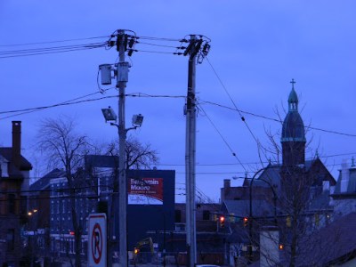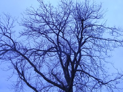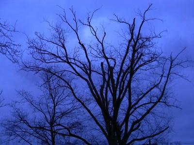 That’s my Mundo pictured above; it’s parked in one of my usual spots at the health club (I commented on this parking spot previously at this post). I came out of the club this evening at just about 6pm and saw the incredible blue hue you see in all of these photos; none are adulterated. It was as if everything was glowing. I’ve said it before, but dusk and dawn are truly magical (I think) for many reasons, one of them is the the light. The picture directly below is what I see when I look straight out over where the bike is parked, looking out over Buffalo’s East Side. The two trees below are just to the left…I really think barren trees in the winter are beautiful, and this light only accentuates this. Anyhow, the other thing I wanted to comment on was the parked bike…it’s just as I found it when I came out of the health club. Do you notice anything unusual (look before reading on)?