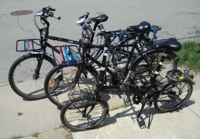 OK, first a couple things. The title of this post is a bit incorrect…it should read how I ride a bike, but I didn’t want it to sound too self-centric (but isn’t that what everyone’s blogs are about…themselves). And the photo above is not recent; it is one I took last spring when I had to move my bikes from my living room for spring cleaning (yes I keep my bikes off to the side in the main living space of my house…don’t you). But they are still the same bikes I ride; from back-to-front…the Yuba Mundo (a cargo bike and still my favorite everyday bike), my winter bike (an old Trek which I bought at a flea market and fixed up and outfitted with fenders and racks), and a Dahon folder (which I use for quick zips around town and bring on day trips to Toronto).