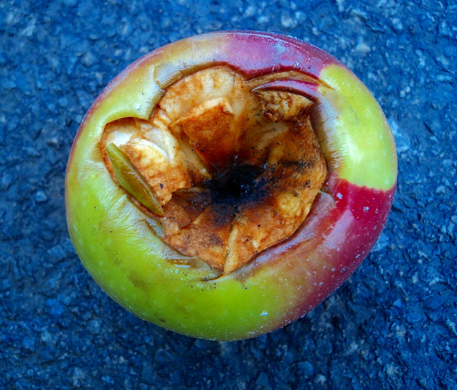 A rotten apple in the middle of the street.