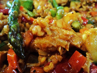 Two portions of seafood and vegetable fried rice. I made this for staff lunch today and it was so good I brought a few leftovers home for dinner. To see the basic recipe being made click here (I also added curry spices to this recipe).