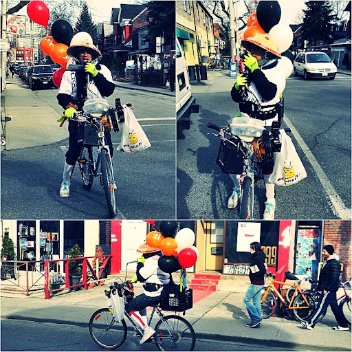I took a day trip with my son to the vibrant city of Toronto. It’s a mere 100 miles / 160 kilometers from my home and a very simple drive (granting you don’t get stuck in rush hour traffic). And every time I go there I realize getting there once or twice a year is not nearly enough. I was window-shopping for another bike (yikes…more on that in a later post) and stopped at three of my favorite Toronto bike shops…Curbside Cycle, Sweet Pete’s, and The Urbane Cyclist. Anyhow, here’s a couple photos of bikes and a bicyclist I saw today. The top is a photo of an old delivery bike leaning against an ornate rickshaw-style trike on Queen West. And the series below are of a guy we saw in the Kensington Market (actually we heard him before we saw him). He has a small amp hanging from his handlebars and a microphone strapped to his face. There’s also a small bongo somewhere, a series of harmonicas, and 3 or 4 tambourines. In the first of the three pictures you can see that he saw me take his photo. He started to slowly pedal toward me as he sang and clanged away. I thought for sure he was going to ask for money. He didn’t. He simply wanted to play his music and get his photo taken. I shook his hand (while he continued to sing and play) and he slowly pedaled away. It’s things like this that really make my day…people quite literally living outside the box that society tells us exists (but I think it only exists if we allow it).