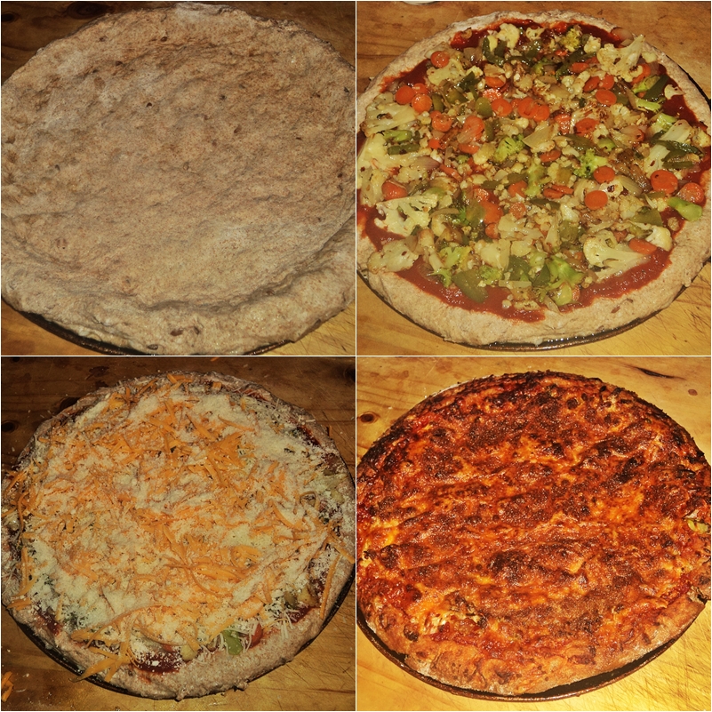 Deep-Dish Pizza with a Whole-Wheat Seven-Grain Crust, Five Vegetables, and Three Cheeses…that’s a mouthful if I ever heard one (pun intended). This is yet another variation of pizza that I made tonight for dinner. The vegetables (onion, pepper, carrot, cauliflower, and broccoli) were cooked aglio e olio style before being placed on the dough. The cheeses I used were cheddar, mozzarella, and Parmesan. When I shaped the dough I formed a sort of ridge around the edge to hold all the ingredients (yum!). Anyhow, for a recipe for the seven-grain bread (with photos and directions), click here. To see how to cook vegetables aglio e olio, click here. For additional pizza recipes, click here.