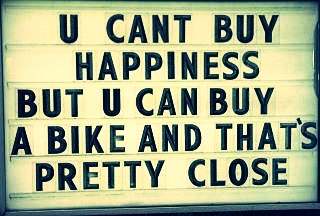 In the event you haven’t seen this floating around the Internet for the past couple weeks I thought I’d post it. When I saw it it made me smile and it still does. But I also find it appropriate because I just ordered another bike. Another, you may ask? My response…Hey, I’ve pared the fleet down to four, only three of which I use. But I did make the personal commitment that if I bring another bike in the house one has to exit…so yes, my loyal and trusty winter bike (aka, the Mule) is going up for sale. If you are in the Western New York / Southern Ontario region and are looking for a good solid–albeit basic–bike that can carry you and your stuff through every weather element, contact me. Anyhow, I’ve been seeking a simple but hefty (and inexpensive) cargo bike–a smaller version of the Mundo–for daily rides, and I think I found one. I love the Mundo but find I don’t always need 7ft of bike when I’m only carrying myself and a gym bag or other small item. Anyhow, more on this later in the week. I’ll post pictures. And yes…a new bike does make me happy.