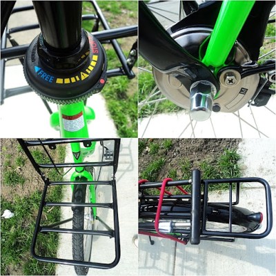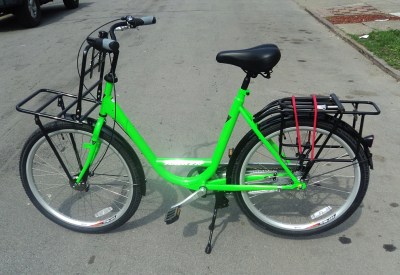 Yep…loving this bike so far but not the color (more on why I purchased this color below). I’ve been in the market for a somewhat inexpensive bike to replace my winter bike (aka…the Mule; aka…my home built cargo bike). This is not to replace the Mundo (which is still my favorite bike); it’s just that some days–many days–I don’t need 7ft of bike to ride to-and-from work, the health club, or the store for a few items…but I still want a bike to carry stuff. I’ve looked at the above bike many times (on the website, not in person) and have also thought of the Africa Bike 3 (that’s one of the reasons for my visit to Toronto last week). What I would really like, but is way out of my price range, is a Batavus Personal Delivery Bike, but the Torker Cargo-T–pictured above–is actually based on the Batavus Bike (albeit an economy version). So here is the reason for the bright green color (it is so very green, isn’t it?)…after checking the Torker website recently I found they no longer had the Cargo-T listed, turns out they stopped making this particular model…but they still had a few of last year’s models in the warehouse. So after contacting Torker, and then my local bike shop, I was able to get a deal on one of last year’s bikes at nearly $150 discount…but this was the only color they had left (not a surprise…it’s only two colors available were this neon green and grey). But seeing how I like all my bikes black–either purchased that way or painted by me–the next time you’ll see a post of this bike it will likely be black…two cans of matte black paint were the first things I carried home today. Anyhow, as I had to work a double shift today I only had a chance to test ride it for a few miles but I really liked it. And I find it interesting in that in all of the positive reviews I’ve read (haven’t found any negative) a lot of people describe this bike as like riding like a tank or comment on how heavy it is. It is heavy (steel frame), but after riding a Mundo for the past few years this bike seems sort of…well, small. Will this bike replace my Yuba Mundo…not a chance. But do I like it…most definitely yes. I’ll post more on my views of it after I ride it more, but in the meantime if you are interested in reading a well-written review of this bike click here (it’s a review of the 2009 version; they didn’t make a 2010 that I know of).