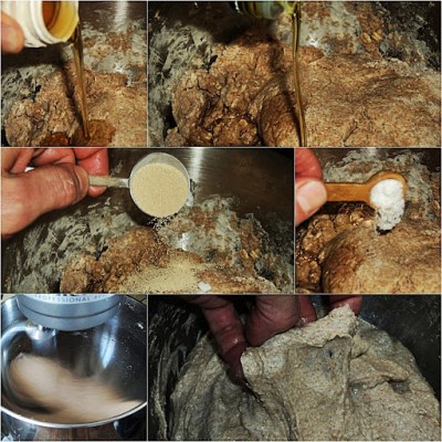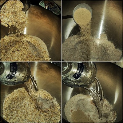 Place two bowls side-by-side. In one, start an autolyse with the bulk of the flour, oatmeal, and some water. In the other, start a preferment (biga) with the remainder of the flour, water, and a portion of the yeast. Allow these mixtures to rest and ferment for at least an hour but up to 12 hours.