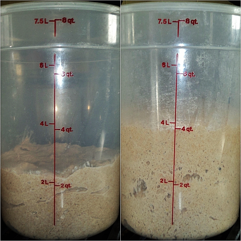 Transfer the dough to a bowl or dough bucket, and allow it to rise, double in size, and ferment for about an hour. Push the dough down and allow it to rise again.