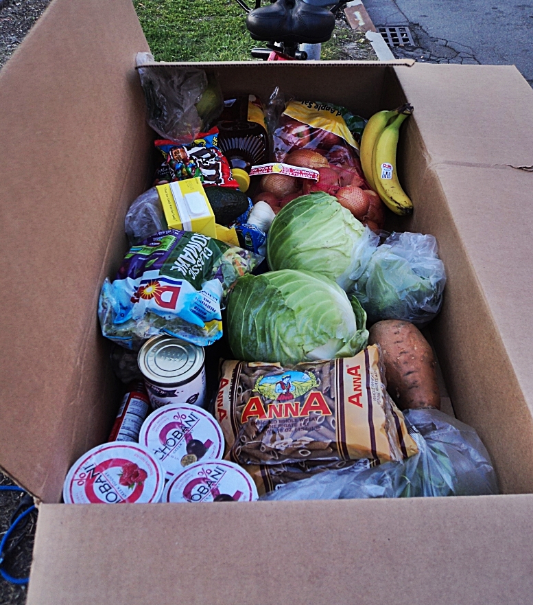 A gym bag full of wet clothes (front rack), a large cardboard box containing $52.54 in groceries, a smaller cardboard box on top of the large cardboard box containing two slices of pizza.