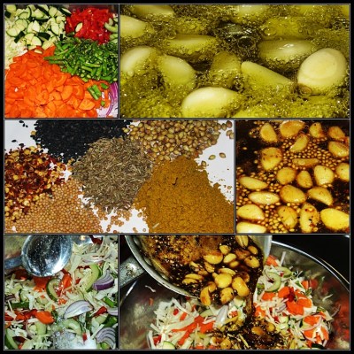 Slice, chop, and shred enough of your favorite vegetables to feed 12 people (I used red onion, cabbage, carrot, zucchini, asparagus, red bell pepper, celery, cucumber, and green beans). Mix the vegetables together in a large bowl and sprinkle 1 tablespoon of kosher salt over them; mix the vegetables again and set aside. In a small skillet, combine 1 cup of olive oil and up to 25 whole garlic cloves (their sharpness is greatly diminished when they braise). Place the pan over low-medium heat and cook the garlic for about 20-30 minutes…it will simmer for quite a while before it begins to brown, if it browns too quickly the heat is too high. After the garlic is lightly browned and soft enough that it can be mashed with the back of a spoon, remove it from the heat. Stir into the oil-garlic mixture–while it is still hot–1 tablespoon curry, 1 tablespoon black sesame seed, 2 teaspoons crushed hot pepper, 2 teaspoons whole coriander seed, 2 teaspoons whole cumin seed, and 2 teaspoons whole mustard seed. All the spices to cook in the hot oil for about 30 seconds, stirring them gently, then pour this mixture over the raw vegetables. Add 1/2 cup of lemon juice and gently stir the salad. Allow it to rest for 5 minutes before serving.