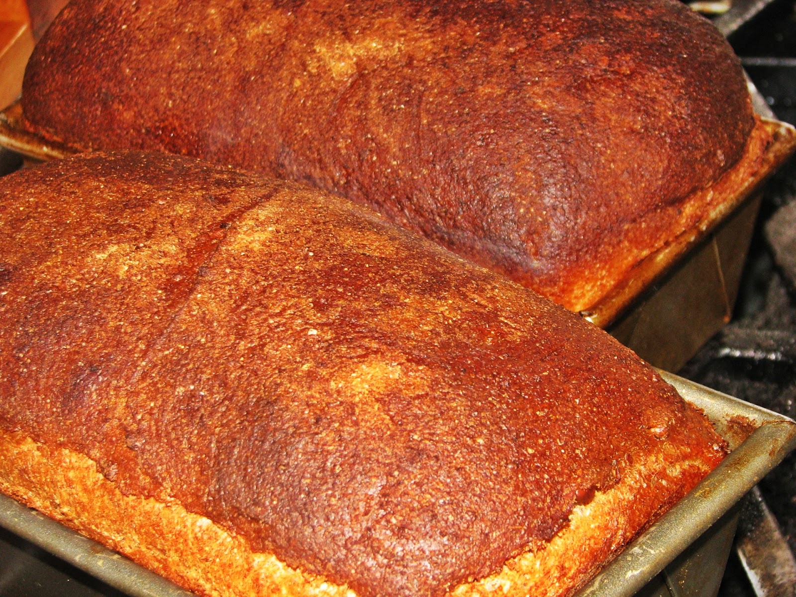 Bake the breads for about 30-40 minutes, adding steam to the oven a few times (either with ice cubes or a spray bottle) and rotating the breads every ten minutes. The breads are done when they are dark brown and sound hollow when tapped upon. Remove the breads from their pans and allow them to cook on a wire rack for at least 10 minutes before slicing.