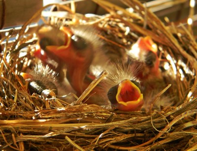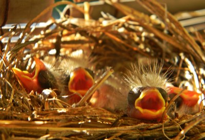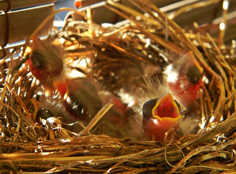 Okay…firstly, this is incredible. A tiny little bird family on my front porch. But the reason I say it is inconvenient is its location…on a faux bamboo shade to shield the sun from my house on a hot day..today it was 89F/32C. I noticed the bird’s nest starting to take shape a few weeks ago and before I knew it I could see a bird sitting in there; I figure she was guarding eggs. I can see the nest from the window next to my computer and glanced out today and saw the little beaks sticking up over the straw. I went out and stood on a chair to get pictures. I didn’t want to get too close (I used the zoom) but still the mother flew away when I stood on the chair. I snapped a few quick pictures and got down before momma bird came back with papa and a few of his friends (maybe I’ve watched too many Alfred Hitchcock movies). She came back almost immediately after getting off the chair. It’s night now, and as I type these words I can see her silhouette perched in the nest with her chicks. I’ll not be able to use that shade until they leave the nest, I suppose. But it’s worth it. Sometimes it’s so easy to forget (I’m speaking of myself here) how incredible and amazing the fabric of life is. Things like this help me remember.