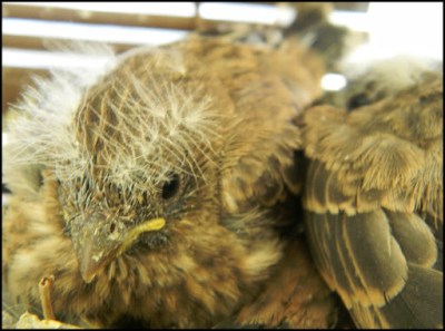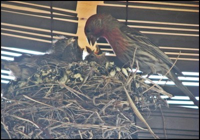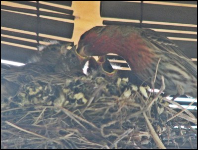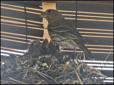 So I was finally able to capture a couple pictures of the papa bird feeding the baby chicks (the top and bottom photo). And second from the bottom is the mother bird keeping a watchful eye as usual. Their breed was also identified…House Finch (thanks Rita!). And the image below is a closeup of one of the babies…they have become so full and chubby–and full of feathers–in less than two weeks. I’m pretty sure there are four in the nest. The reason the pictures of the parents are somewhat blurry are that I’ve had to take their photos not only from a distance (they hear the camera turn on, I swear) but also through an unwashed window (I really do need to clean my windows). Anyhow, to see previous pictures of the birds–in chronological order–click here, here, here, and here.
