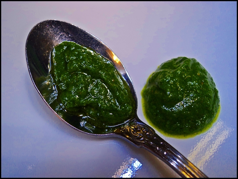 You’ve likely had this sauce/condiment before…maybe you purchased it or had it at a restaurant; or maybe you’ve made it. But with the summer upon us, gardens–and supermarket shelves–are bursting with fresh herbs. Originally this was made by pounding everything with a mortar and pestle (the Italian word pesto loosely translates as “pounded”), but today a few second zip in a blender does the job. The recipe below is a variation on the original, which is usually based on basil alone, but for variation I’ve used five fresh herbs. Sealed and refrigerated, pesto will keep for weeks…but you’ll likely eat it first 🙂