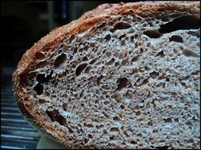 Bake the breads for about 30-40 minutes, adding steam to the oven a few times (either with ice cubes or a spray bottle) and rotating the breads every ten minutes. The breads are done when they are dark brown and sound hollow when tapped upon. Remove the breads from their pans and allow them to cook on a wire rack for at least 10 minutes before slicing.