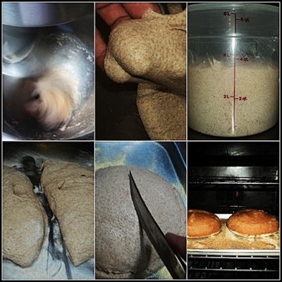 In one bowl make a preferment by combining 2 cups of whole wheat flour with 1 cup water and 2 teaspoons of instant yeast. Begin the autolyse in another bowl by combining 4 cups of whole wheat flour, the wheat gluten, and 2 cups water. Stir each bowl just enough to combine the ingredients, taking care not to get yeast into the bowl with the autolyse. Cover both bowls and allow to rest and ferment for 30-90 minutes, during which time the preferment will begin it’s job multiplying yeast and fermenting flour, and the autolyse will soak the grain, swelling the gluten.