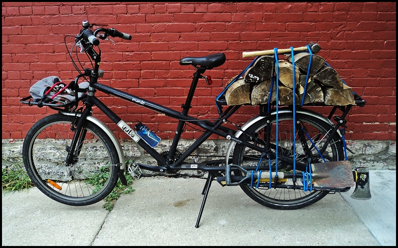 Ten split logs (firewood), an axe, a small shovel, a 3lb. mallet, and a canvas bag containing–among other things–a book, a magazine, a cell phone, and an extra camera.