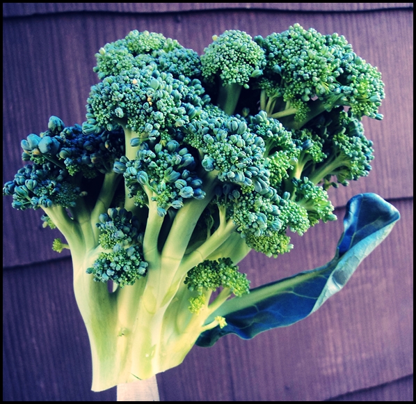 Though I have a small garden in the front of my house this (pictured above) was plucked this evening from the garden in the rear of the house. Beautiful, isn’t it. I have only about six broccoli plants (two out front and four in the back) but this time of year it grows almost quicker than I can consume it. Tonight I sauteed it simply with onion, garlic, and a hot pepper from the garden as well. This is a great vegetarian main dish as itself or tossed with pasta. But tonight I ate it as a side dish with pasta in a 20-minute tomato sauce. There’s a recipe below, but if you want additional recipes and background info on broccoli feel free to read this article I wrote for Artvoice a few years back.
