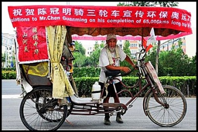 This story, I believe, is truly inspiring on many levels. That’s Chen Guanming pictured above, who says that he has traveled more than 60,000km/40,000miles in the past 2 years–traversing 16 countries–from his homeland China to London to see the Olympics…and doing it all on his large cargo trike. What’s more, he’s in his late fifties. I wonder if he and Heinz Stücke met each other in passing along the way. To read a couple brief stories about him click here or here, and the below video is interesting as well.