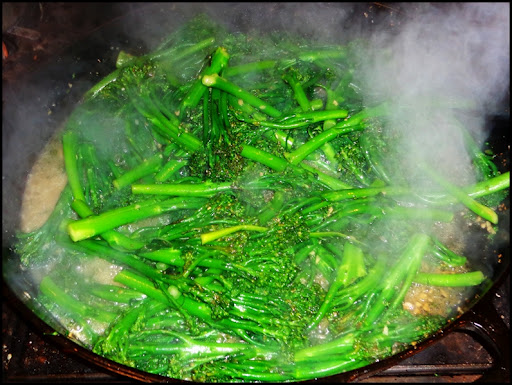 If you’ve been to this site before you know a few things about my cooking and eating habits. One is that I love whole wheat bread, especially Ezekiel Bread, and another is that I can–and nearly have–eat any vegetable sauteed in oil with garlic and hot peppers. This is just another example. I cooked this broccolini yesterday for a side dish for staff lunch. The recipe is below, but if you’d like additional recipes (with photos) of many other foods cooked in this fashion, click here.
