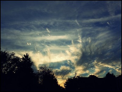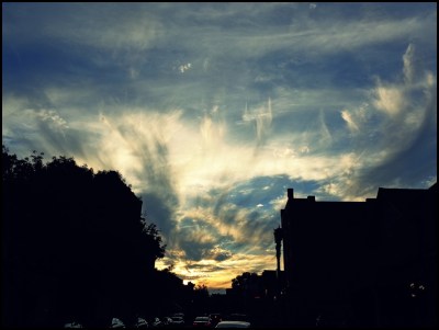 If you’ve been to this blog before then you know that I enjoy taking photos of the sky. And lately there have been many opportunities…there have been the craziest swirly cloud formations. I took the first two photos on my way home this evening, and then about twenty minutes later–as I left the house to go pickup some Chinese take out–I saw the below scene…it was as if the sky was on fire. Incredible.