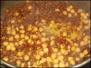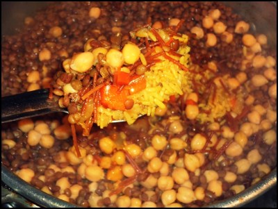 Then the other key thing is technique, and adding ingredients in proper succession. After sauteing any vegetables (besides onion, I also used carrot and pepper) and garlic, then the spices to bring out their flavor. Then add the rice, then the pasta, then any cooked beans (I used chic peas and lentils)…and don’t forget a pinch of salt. After adding the ingredients stir it once, bring it to a boil then lower it to a simmer. Cover the pot and simmer it until the liquid is evaporated and the rice is cooked. Do not stir the rice until it is cooked. For brown rice the ratio is generally 1 part rice to about 2-3 parts broth. Cooking time is anywhere from 30-40 minutes. Remove the pot from the heat and allow it to rest for about 5 minutes. When you remove the lid the colors and aroma will be intoxicating…and wait until you taste it….