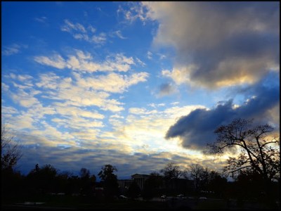It has been magnificently autumnal these past few days. Crisp and chilly air, and great weather to ride a bike in (you don’t sweat). Anyhow these photos were taken yesterday and today; all while I was out doing errands. They were also taken with my little $99 point-and-shoot camera which fits so nicely in my jacket pocket. Anyhow, the above photo was taken yesterday as I skirted Hoyt Lake on my way to the Curly Pedestrian Bridge. The bottom two were taken this evening. Both are looking west as the sun sets. In the bottom photo you can see Albright-Knox Art Gallery.