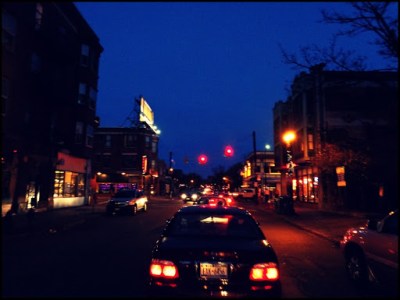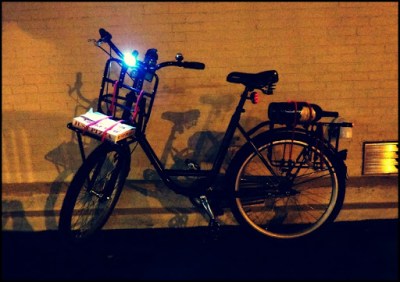 I had a crazy day at work today (I’ve been saying this a lot lately)…rushing around for most of the morning and afternoon, and then just before the workday was done a planning committee informed me of everything they have not liked for the past yearly quarter…which was pretty much everything. Needless to say, between the stress of a hot and bustling kitchen and trying to please a board of directors, when I left work it felt so good to hop on a bike and get out into the crisp open air of autumn. There really is nothing like it (and if you ride a bike you know what I am talking about). Anyhow, the above photo was taken as I waited for the light to change at my favorite intersection in the city, Allen and Elmwood, in the heart of Allentown; the neighborhood in which I both work and live. And on the bike below (#405) are two slices of pizza and a bottle of red wine…tonight’s dinner.