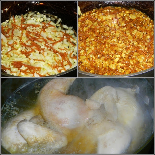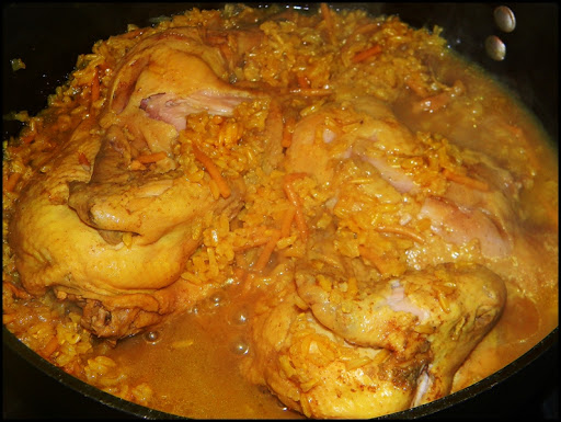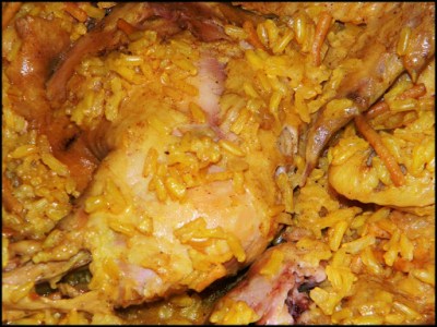 This is yet another variation of my Lebanese chicken-and-rice recipe. The reason I say “sort of” in the title of this post is that I didn’t use ground lamb–which is in the original recipe–and I color/slightly flavor the dish with turmeric (along with the other spices), which is not normally in this recipe. In addition, in the recipe pictured I used a whole split chicken (which I poached in chicken broth before using the broth and the chicken in the recipe); the recipe listed below utilizes just the chicken breast. Anyhow, if you’d like more Lebanese inspired recipes, or to see this one being made, click here.
